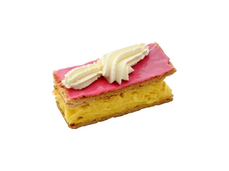 Krokant bladerdeeg gebakje met banketbakkersroom en roze glazuur